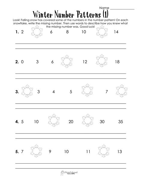 Patterning Worksheets: Number & Counting Patterns • EasyTeaching.net. Observe the following growing patterns of numbers. The number pattern worksheets feature rows of numbers with a pattern that follow a mathematical rule.